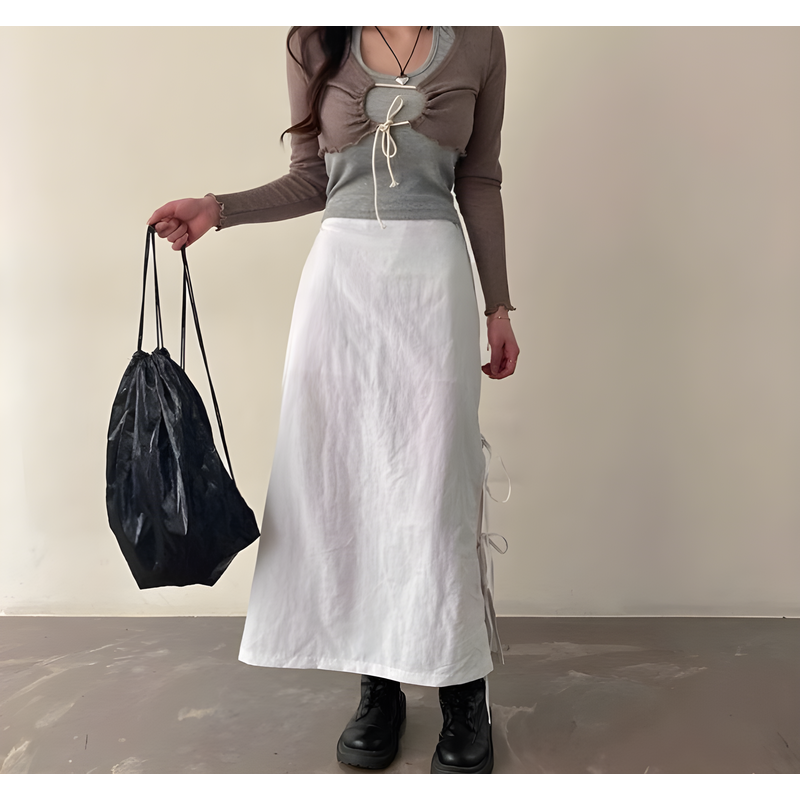 [당일발송🚀/여름특가🌊] 화이트 롱스커트 바스락 스커트 옆트임 치마 나일론 아노락 사이드슬릿 리본 스트랩 트임 TVC074