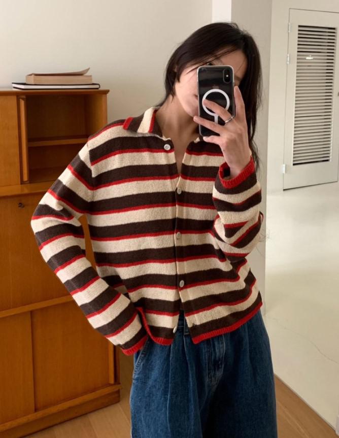 [ROMANTICIZE] 로맨티사이즈 단가라 카라 가디건 코튼 스트라이프 니트 (2color)