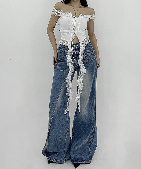 하프 데일리 유니크 랩 스타일 맥시 워싱 데님 와이드 팬츠