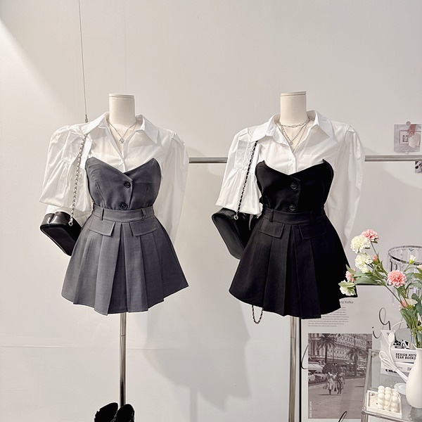 [셔츠+스커트set!/페미닌!] 겨울 베키 하트넥 언발 사선 랩 오프숄더 벌룬 퍼프 긴팔 크롭 뷔스티에 셔츠 블라우스 밴딩 포켓 하이웨스트 A라인 플레어 주름 플리츠 미니 스커트 투피스 세트 [2color]