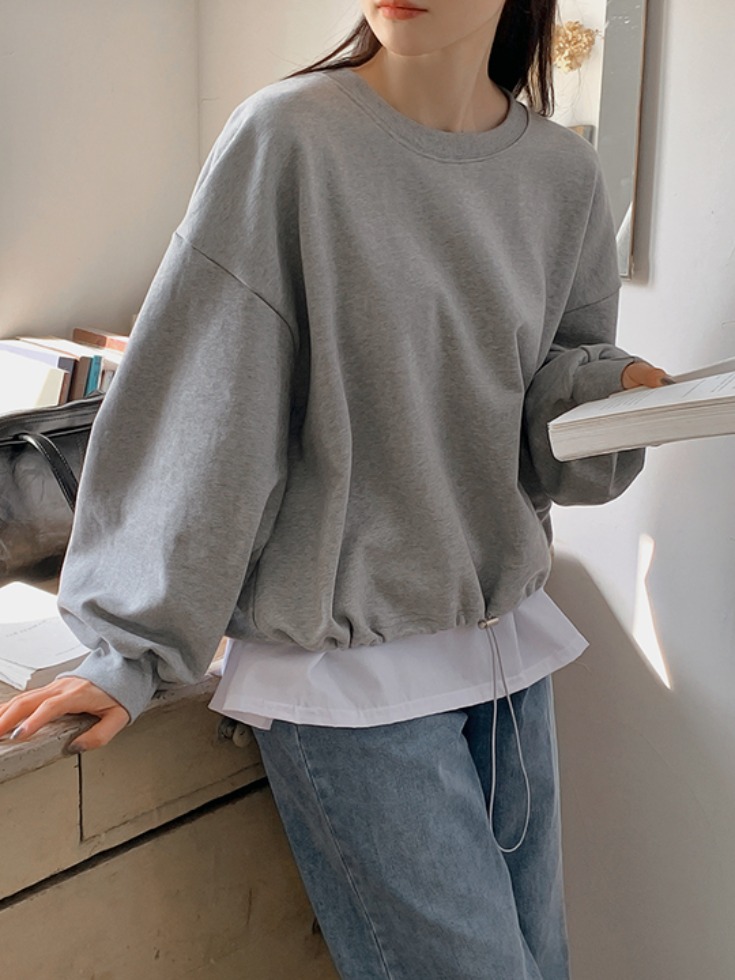 [44-99]마일르디 라운드넥 스트링 맨투맨 레이어드 세트( 신상-봄-개강룩-데일리룩-빅사이즈-99사이즈-레이어드스커트-벌룬소매-루즈핏-세미크롭-여리핏-유니크-셋업 )