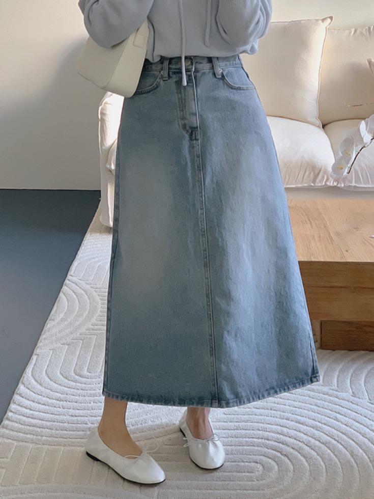 [25-36] 핀니르 뒷밴딩 워싱 트임 데님 롱 스커트 (신상-봄-개강룩-출근룩-데일리룩-빅사이즈-36사이즈-청치마-맥시-뒷트임-슬릿-기본템-베이직-하이웨스트-A라인 )
