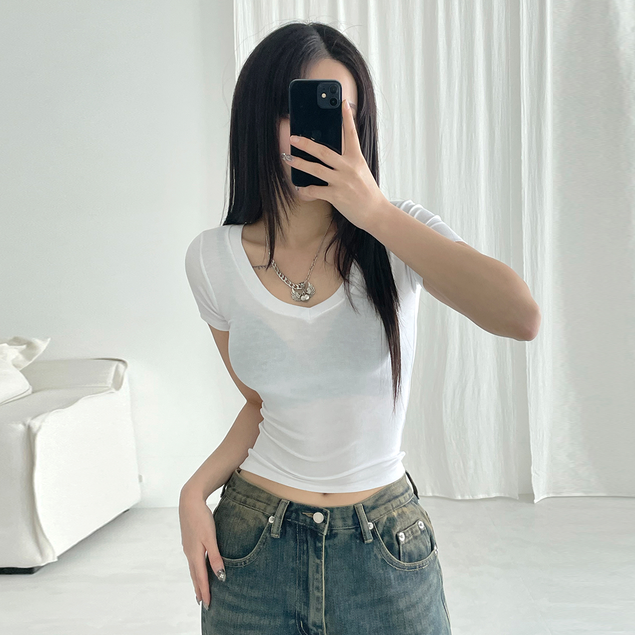 [✨1+1특가✨/허리잘록/글램핏]로완 딥 브이넥 슬림 크롭 반팔 티셔츠