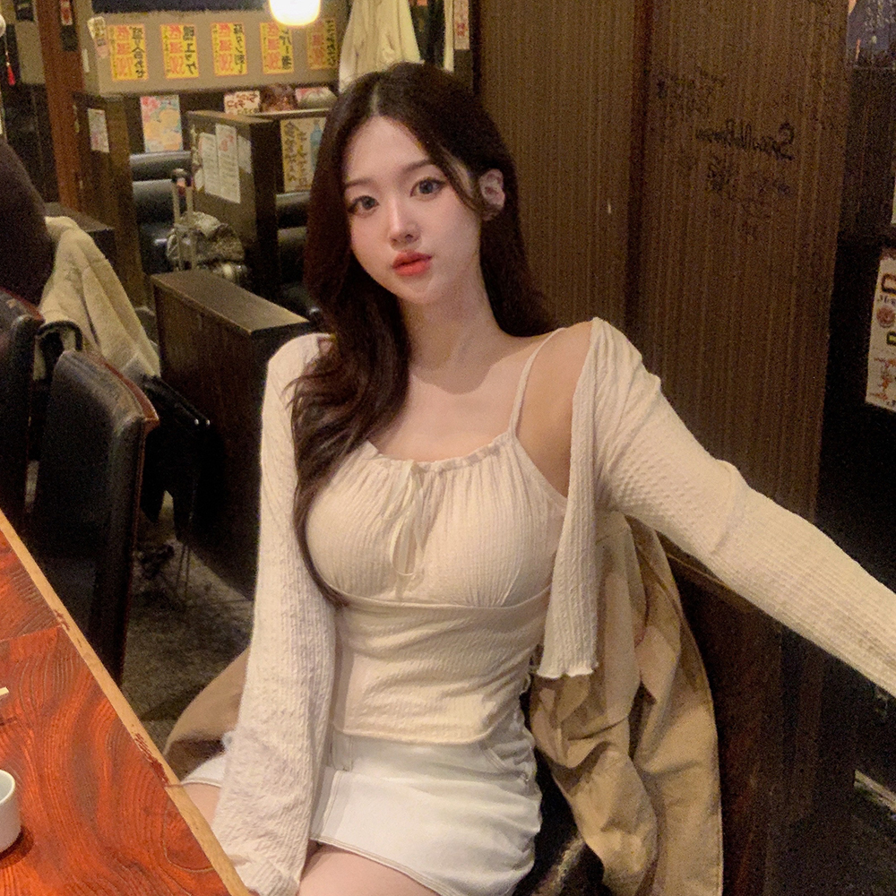 무배🚀[사심추천ㅠ💞여리글램] *캡내장* 프릴 리본 패드 나시 + 브이넥 스트랩 가디건 세트 물결 셔링 투피스 크롭 긴팔 이너 레이어드 끈나시 민소매 슬리브리스 봄 간절기 가을 데일리룩 데이트룩 3COL
