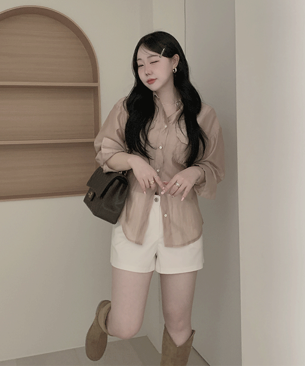 #13192 [스트링SET] 실키 시스루 포켓 허리잘록 긴팔 셔츠 블라우스 : 베이지,연카키 2color