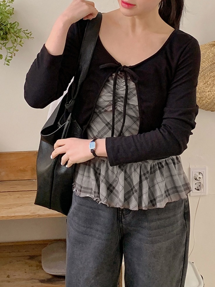 [3천장 돌파✨][무료배송][체형커버/가벼운착용감][44-120] 체디프린 스판 체크 프릴 나시 가디건 세트(봄-신상-봄신상-데일리룩-데이트룩-하객룩-페미닌룩-빅사이즈-자체제작-120사이즈-셋업-투피스셋업)