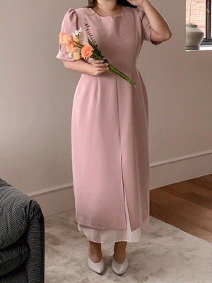 [MADE][55-120]빅사이즈 2부드레스/셀프웨딩/하객룩 프라하 스퀘어 하트넥 스판 쉬폰 배색 퍼프 반팔 머메이드 롱 원피스