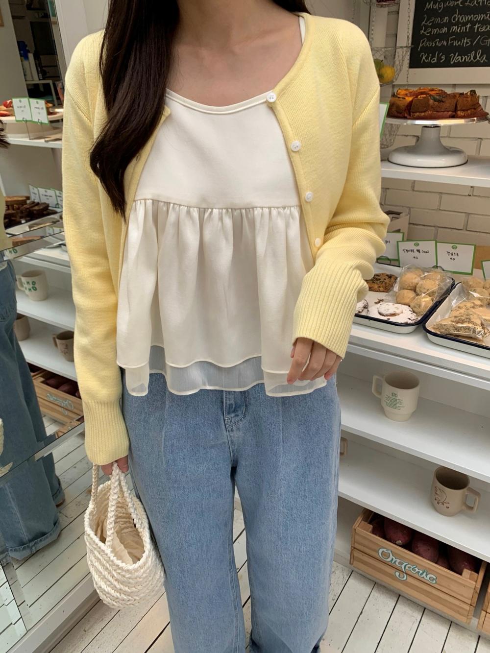 버터 레이어드 나시 블라우스 플레어 뷔스티에 이중 프릴 슬리브리스 (2color)