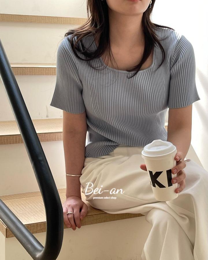 브론즈 스퀘어 니트 골지 반팔 슬림 페미닌 nt (4 color)