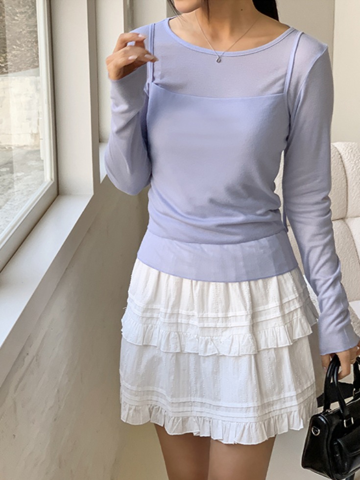 [레이어드템/여리여리핏♥] [44-120] 로랑리빈 시스루 뷔스티에 티셔츠 투피스 세트 (신상-봄-가을-데일리룩-데이트룩-러블리룩-캠퍼스룩-모던룩-베이직-빅사이즈-120사이즈-자체제작-신축성-셋업-투피스셋업)