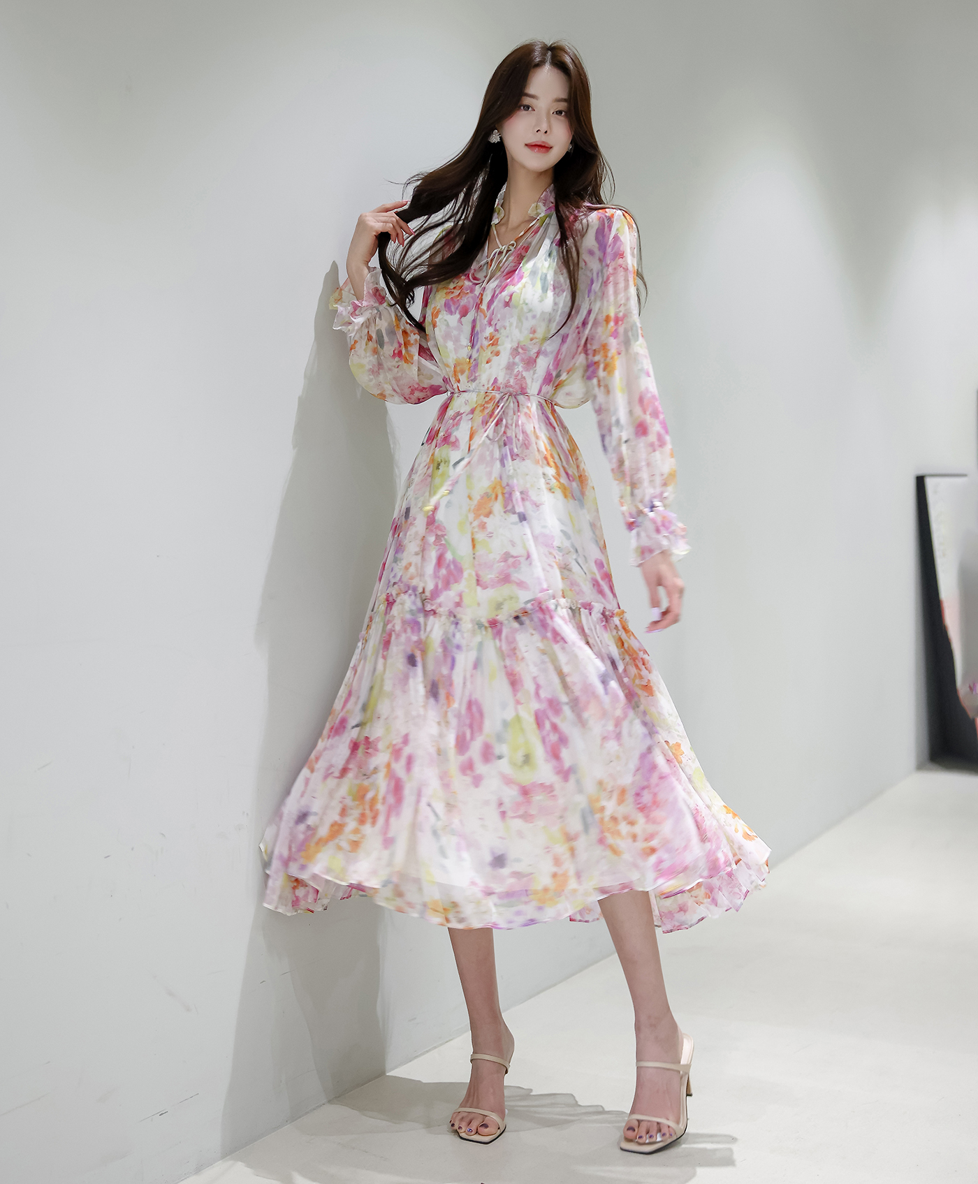 Florida 플라워 쉬폰 프릴 롱 원피스 (S,M,L) - 이너슬립원피스 + 벨트세트 - 40% 세일로 반품교환 불가 -당일발송