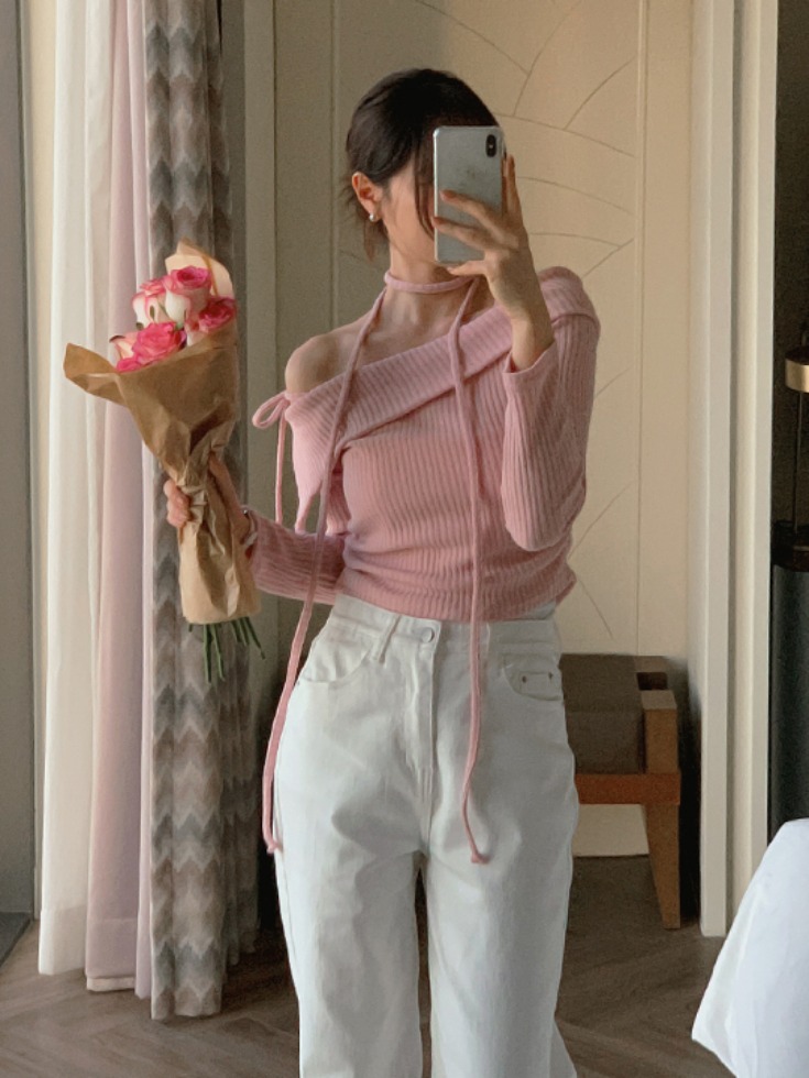 [타이셋업/슬림핏][44-120] 메이헬 골지 오프숄더 셔링 타이 세트 티셔츠 (신상-봄-데이트룩-개강룩-데일리룩-빅사이즈-120사이즈-자체제작-언발-리본-스트랩-크롭-스판-여리핏-셋업-투피스세트)