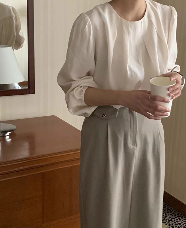 히얼 라운드넥 핀턱 실키 블라우스 - 3color