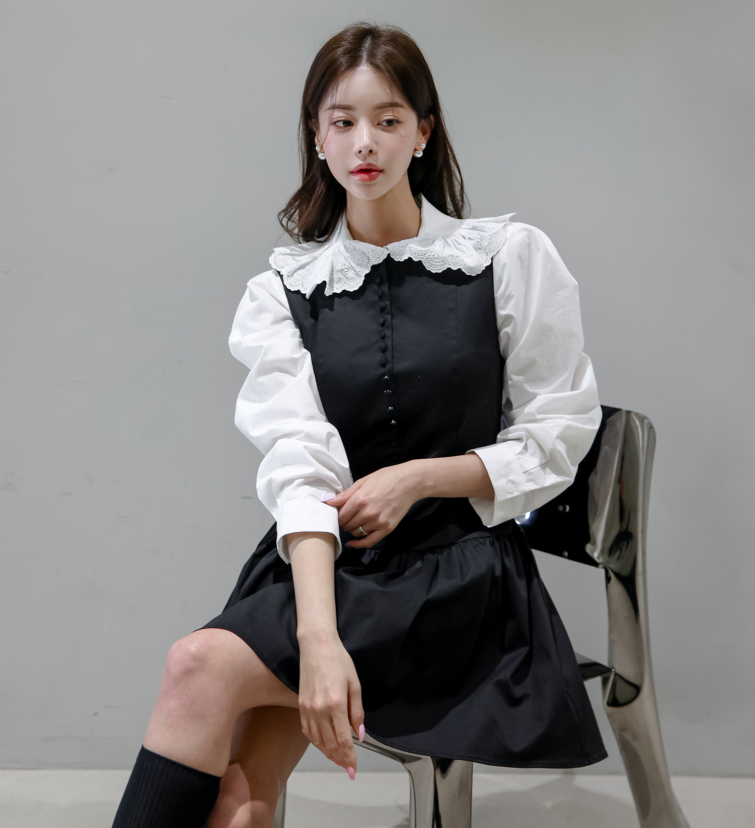 Daisy 플라워 펀칭 레이스 카라 퍼프소매 블라우스 (2color) - 블루 당일발송