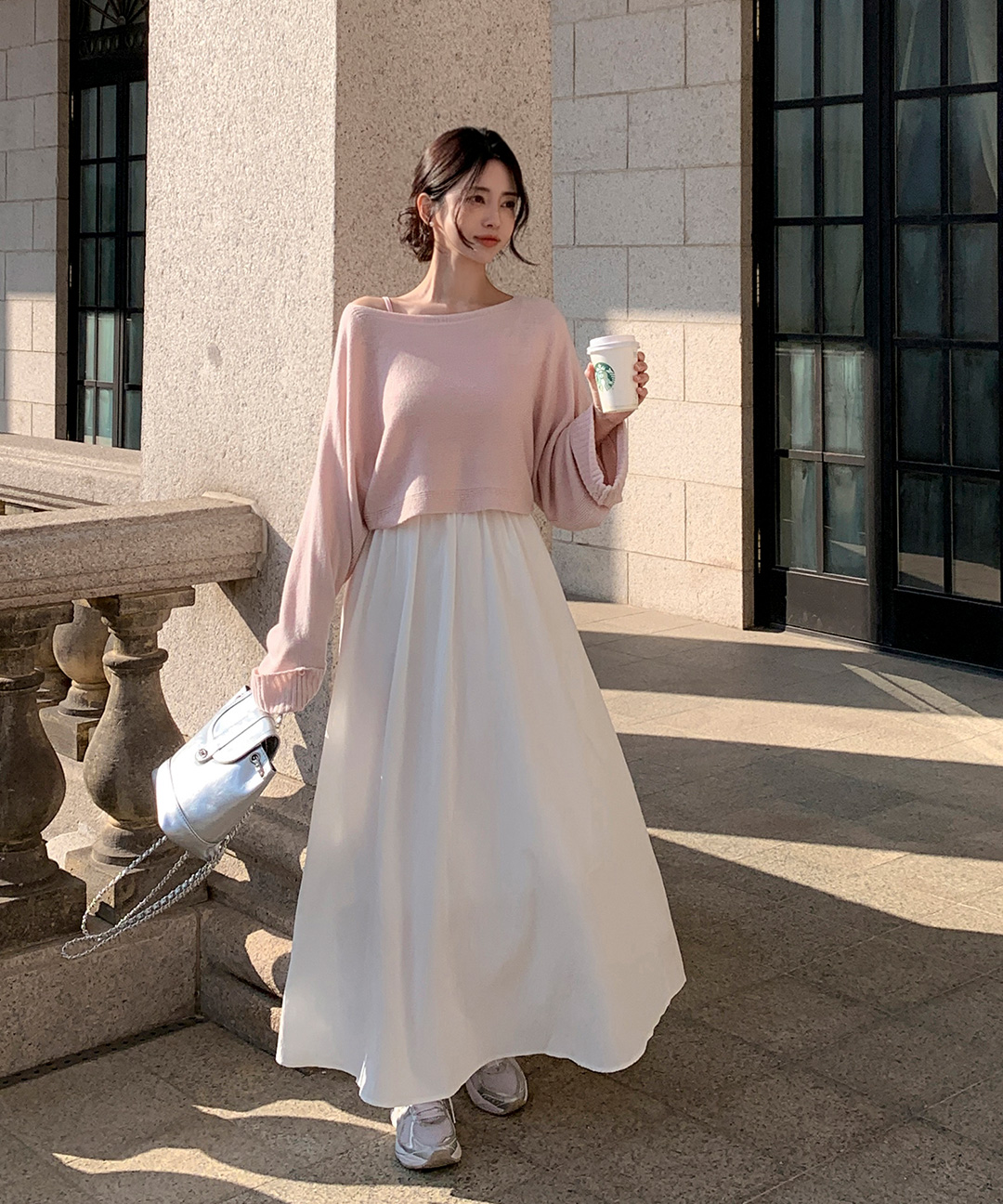 로잔느 코튼 바스락 밴딩 나일론 플레어 롱 스커트