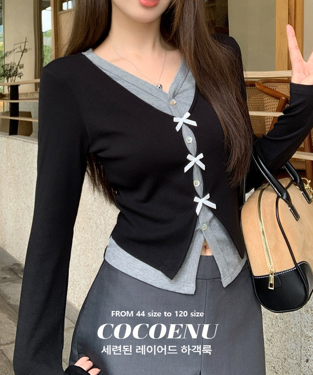 [빅사이즈]무료배송 44-88 두겹레이어 코코앤유블라우스[빅사이즈 리본 레이어드 가디건 신학기 하객룩 봄신상 긴팔 골지 스판 면 데일리]