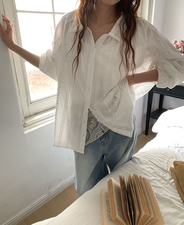 데이지 펀칭 셔링 레이스 블라우스 (2color)