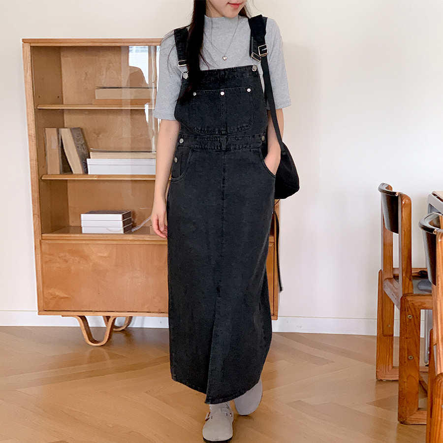 [앞트임💛루즈핏] 무드워싱 흑청데님 멜빵원피스 가을신상 롱 오버롤스커트 롱스커트 멜빵청치마 데님원피스 와이드 꾸안꾸 에이라인