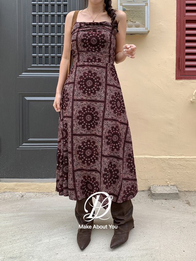 [MADE] 빅사이즈 55-100 차이 페이즐리 드레이프 백트임 밴딩 플레어 나시 롱 원피스 휴양지 룩