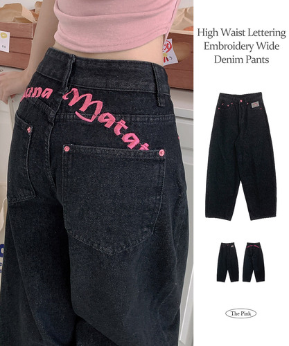 [유니크힙!/패치point/벌룬핏] 썸잉 하이웨스트 레터링 자수 와이드 데님 팬츠