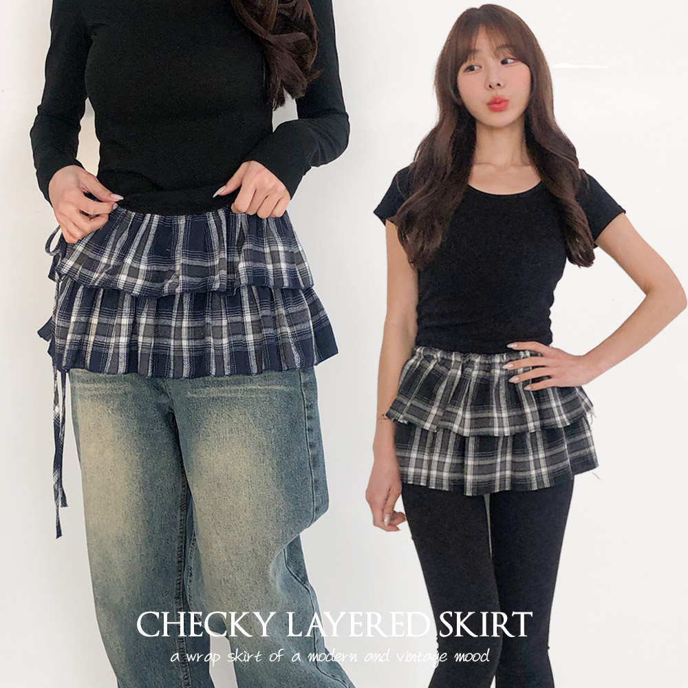 (당일출고)체키 레이어드 스커트 데일리 체크패턴 이중 프릴 캉캉 랩스커트 빈티지 모던