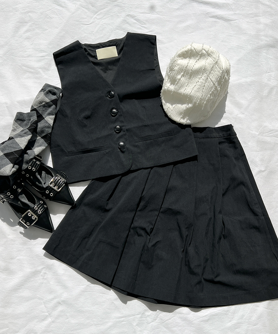 [하객룩/직진배송] 블랙 베스트 셋업 미디 플리츠 스커트 세트