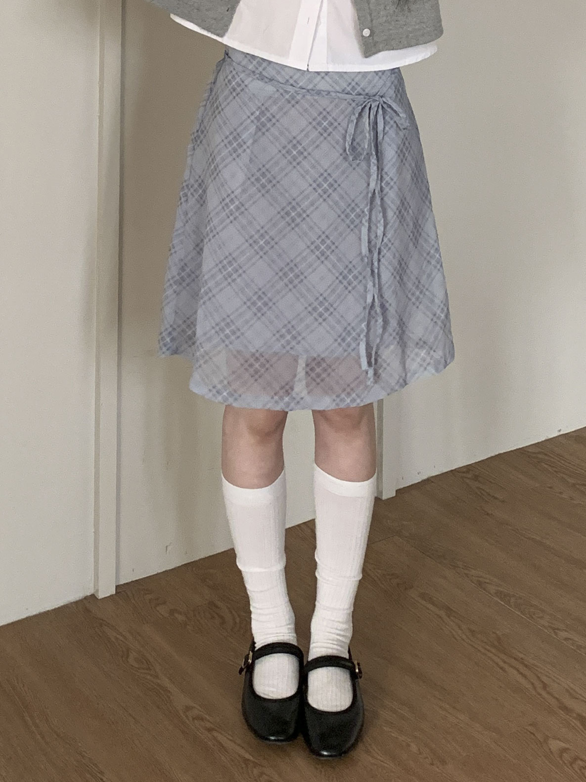 [하체커버] 허시 쉬폰 체크 리본 미디 스커트 2color