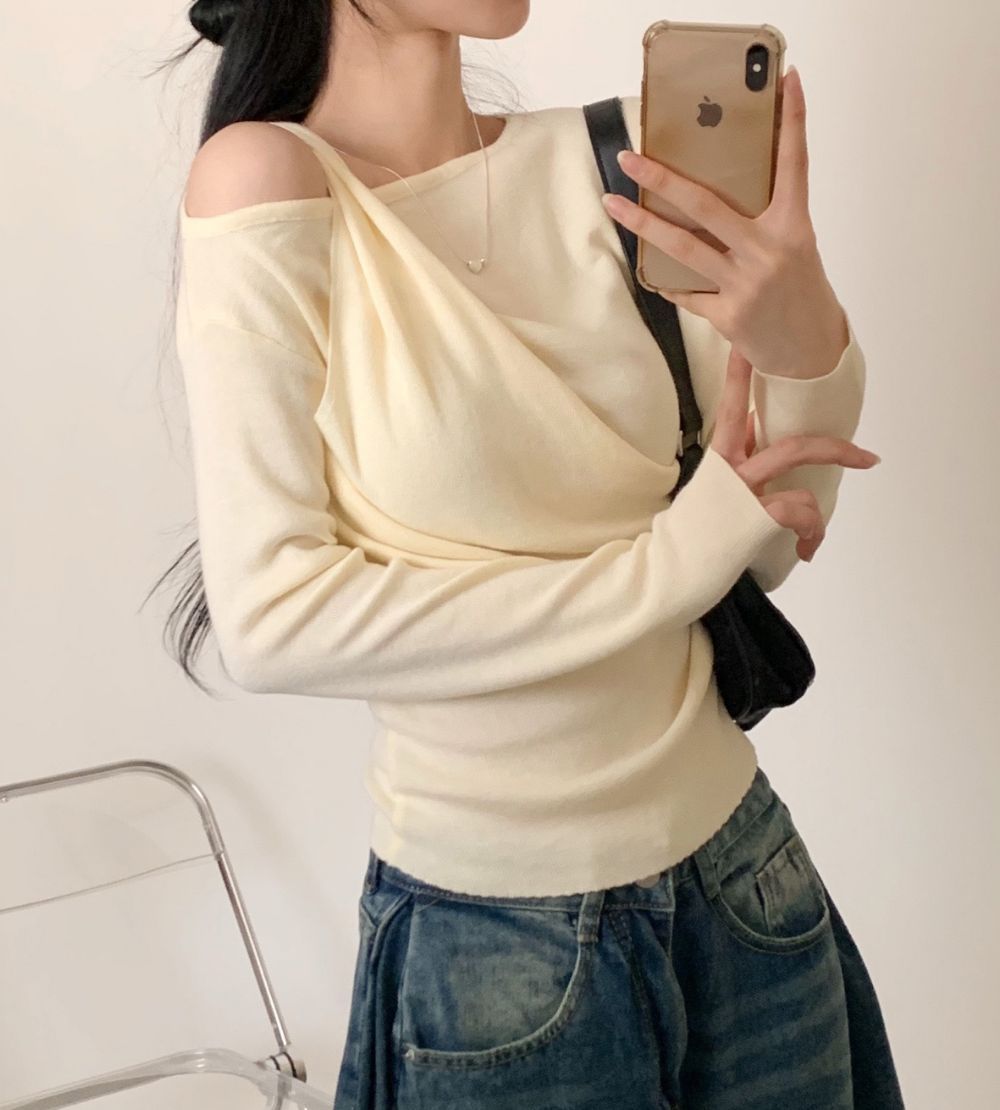 모앳 꼬임 원오프 숄더 레이어드 트임 셔링 크롭 언발 긴팔 니트 (3color)