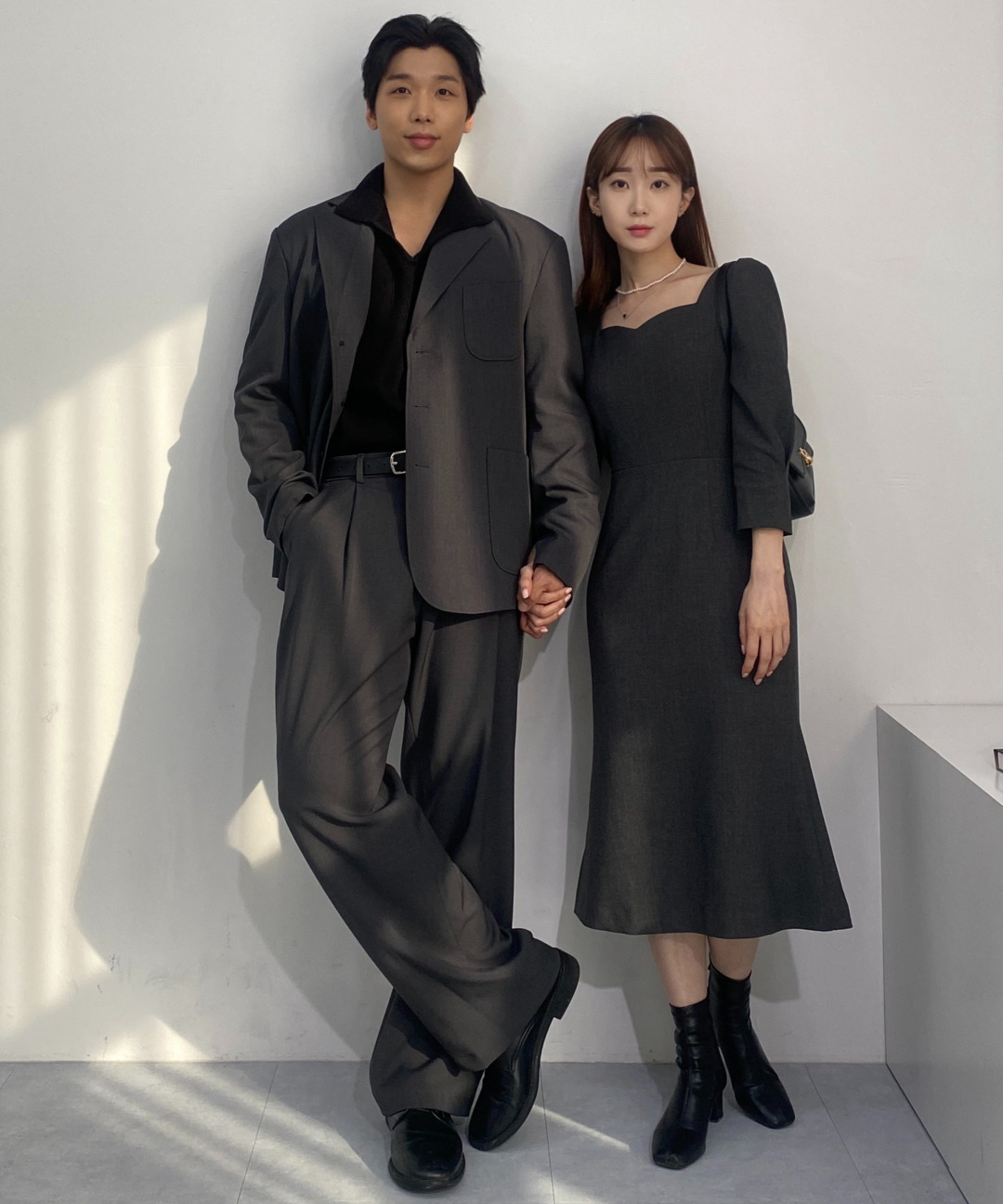 [커플룩/시밀러룩]봄 결혼식 하객룩 상견례 피로연 격식룩 남성 오버핏 정장 슬랙스 수트 셋업 여성 하트넥 롱 원피스