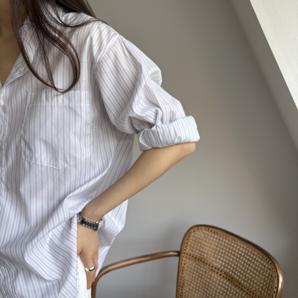 다스티 패치 스트라이프 루즈핏 박시 텐셀 셔츠