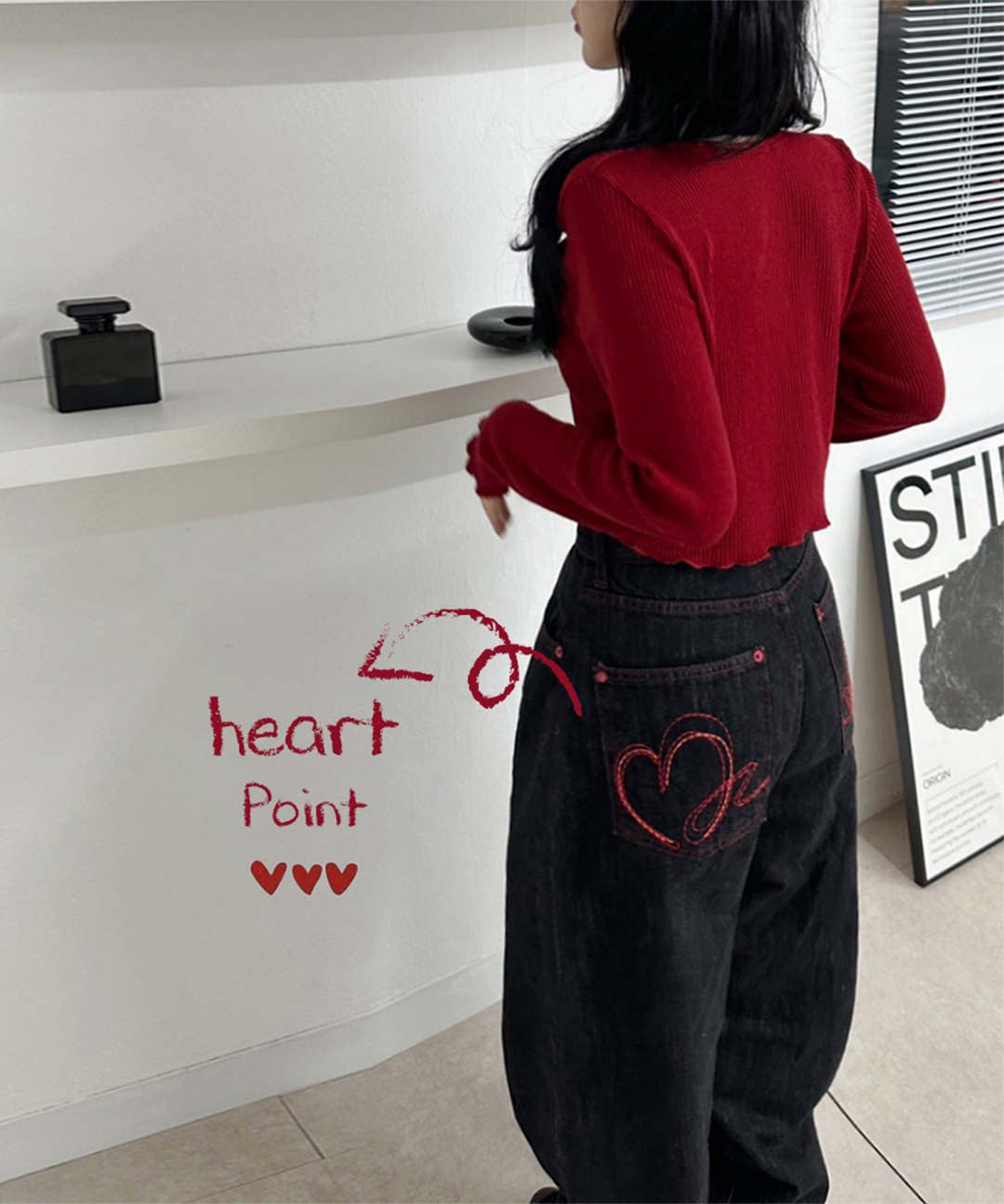 [하트힙❤/골반보정] 하트 레터링 스티치 와이드 벌룬핏 흑청 데님 팬츠 (1col)