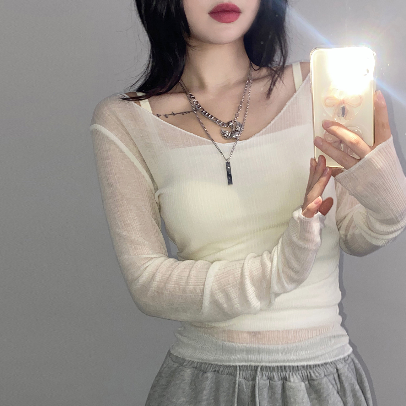 [겨울이너템☃️/울40%/스킨핏/여리템] 조이 텐셀 시스루 브이넥 오프숄더 골지 긴팔 티셔츠