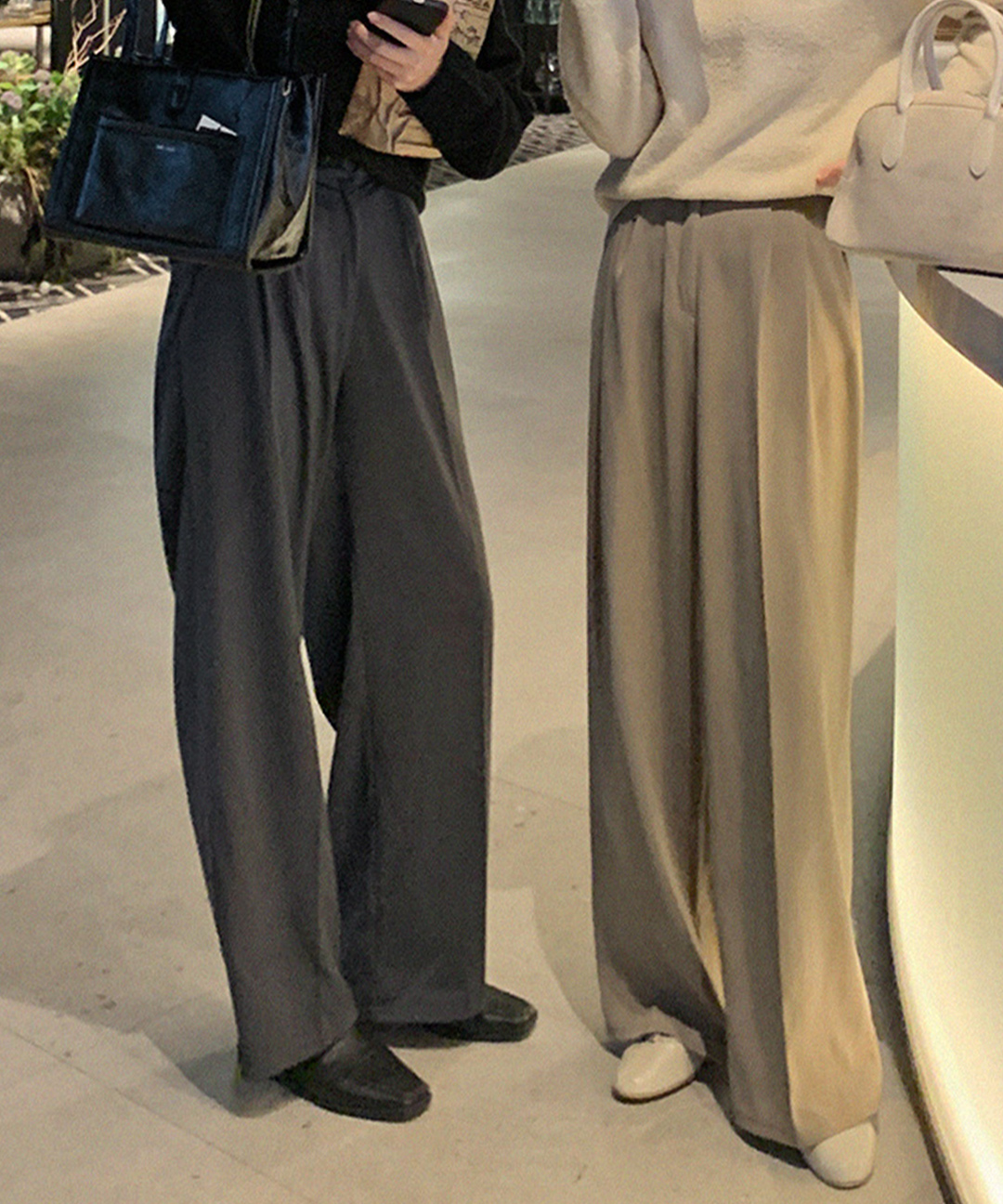 에떼 뒷밴딩 투핀턱 와이드 슬랙스 (25~34) (빅사이즈슬랙스-체형커버-군살커버-간절기코디-롱슬랙스-밴딩슬랙스-여성슬랙스-레직기-칼주름슬랙스-격식룩-출근룩-하객룩)