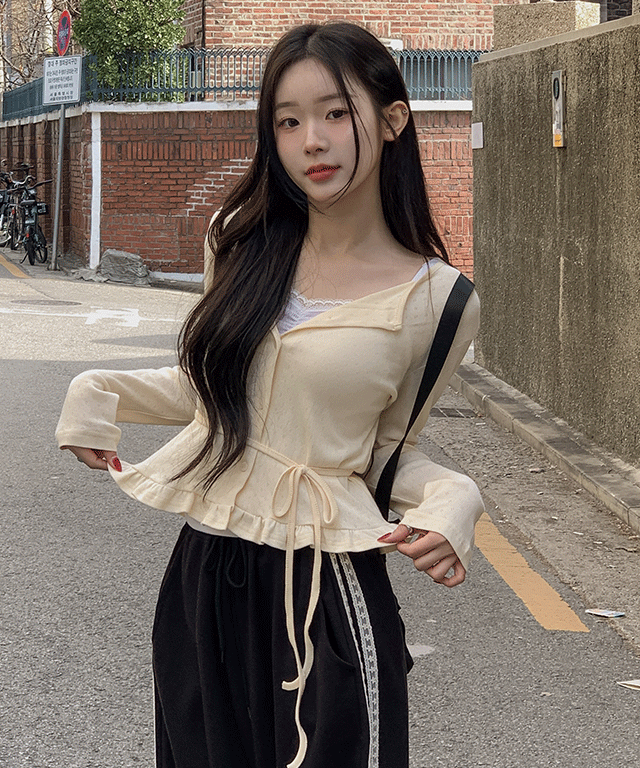 [머플러set/파스텔색감] 아투 라운드넥 펀칭 아일렛 프릴 여리핏 긴팔 가디건 3colors