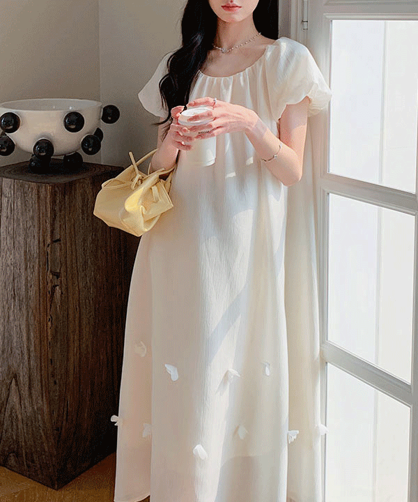 르모디 쉬폰 플라워 셔링 퍼프 반팔 원피스