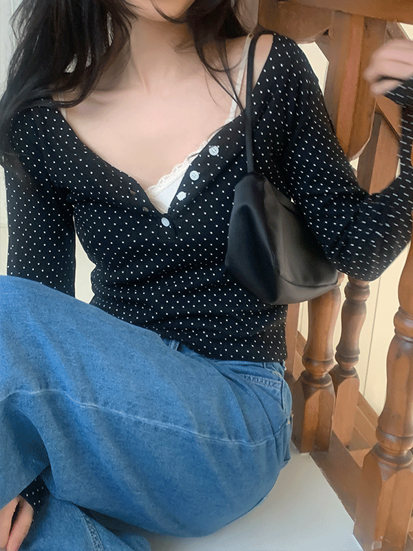 세이부 도트 버튼 레이어드 브이넥 긴팔 티셔츠