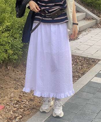 [🌿여름가을] 프릴 포인트 밴딩 롱스커트 , 스트라이프 줄지 면 얇은 봄 여름 가을 간절기 셔링 캉캉 자수 A라인 밑단 플레어 치마 시어서커 코튼 화이트 블랙