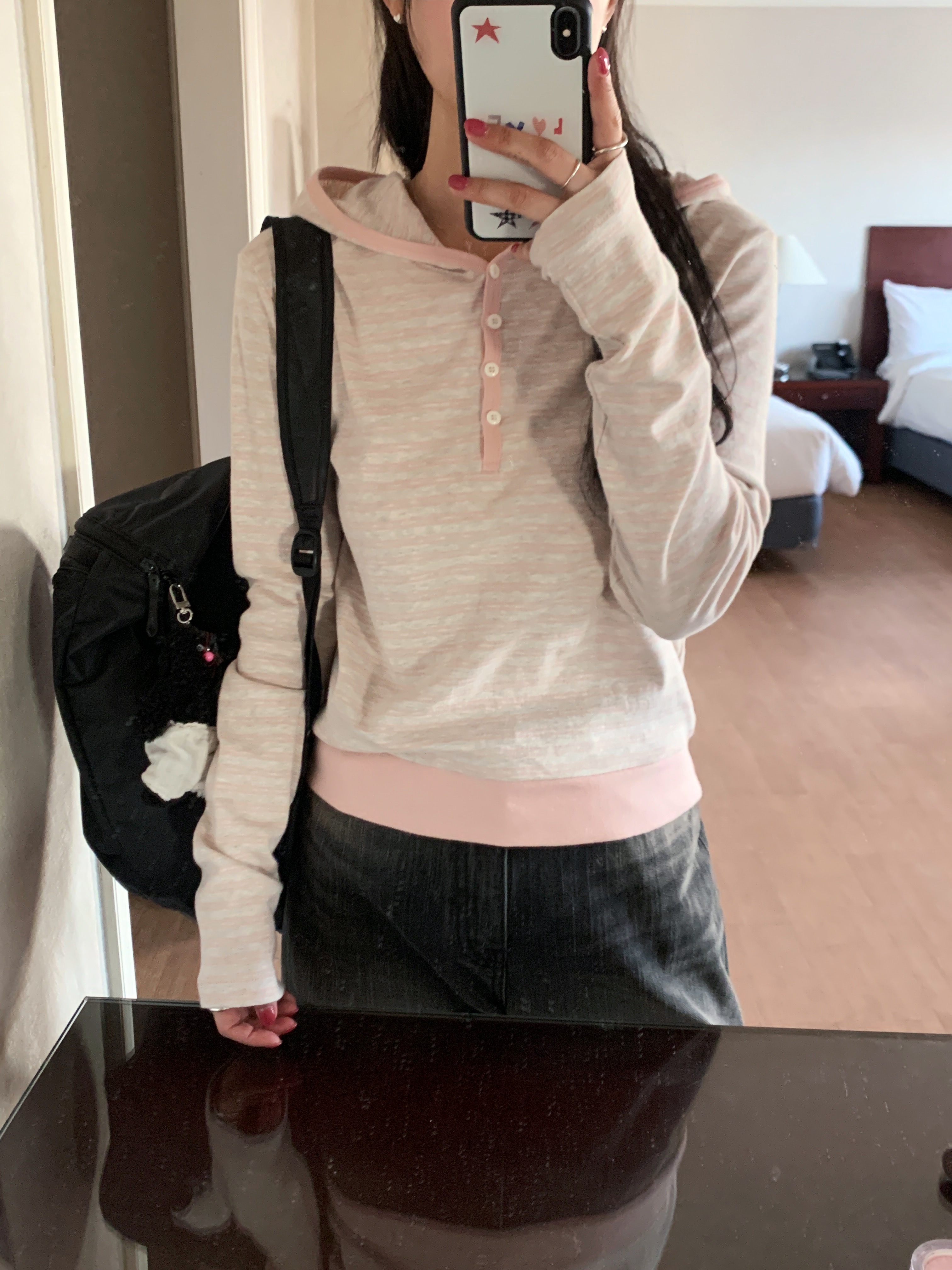 [캠퍼스룩🏫] 시오 스트라이프 후드 T - 4color (후드티/줄무늬/단가라/버튼/캐주얼/캠퍼스룩)