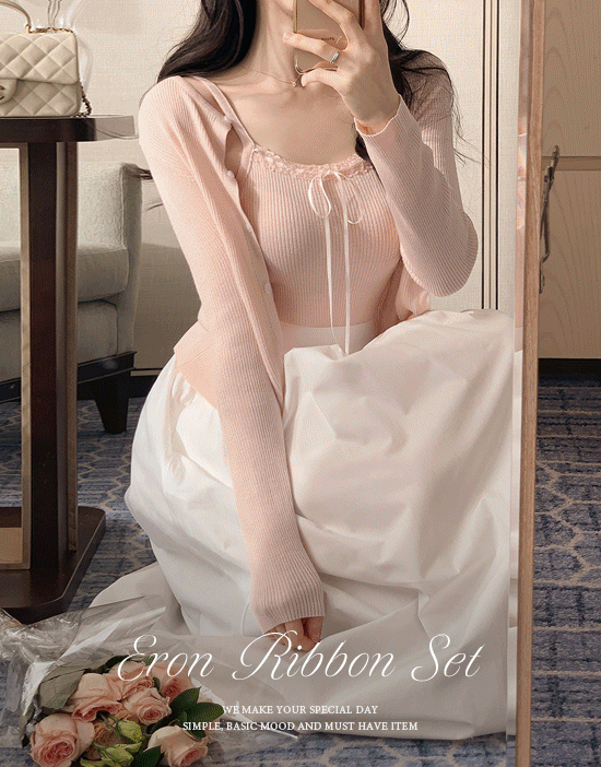 단독)에론 리본 나시 가디건set(투피스/레이어드/슬리브리스/라운드넥/레이스/리본/세미크롭/데일리룩/데이트룩/여친룩/출근룩/오피스룩)