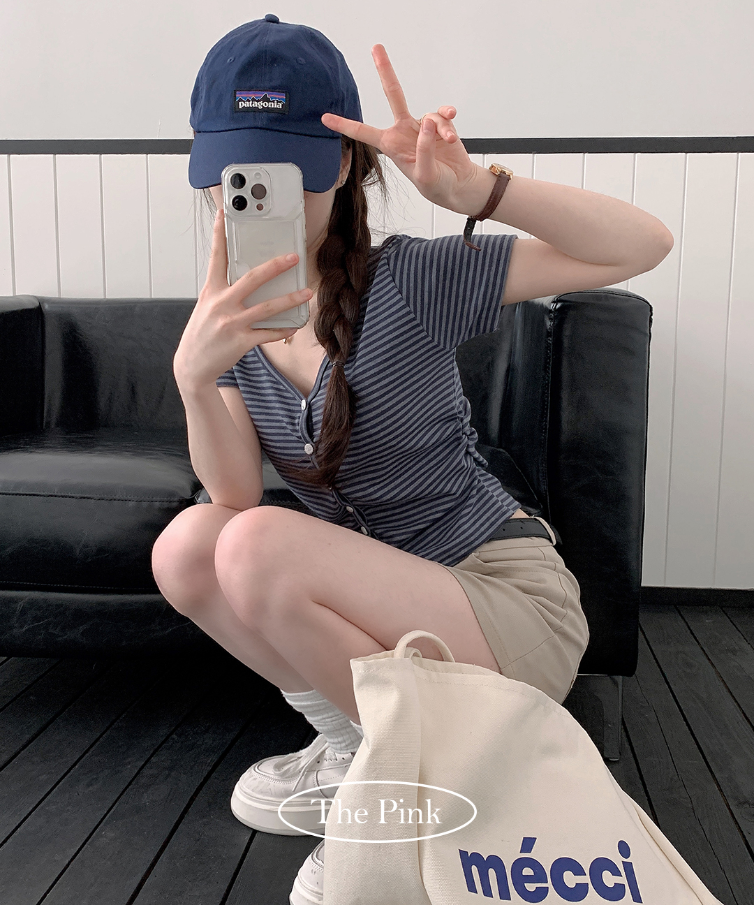 [허리쏙핏/캐주얼힙] 마로 앞셔링 스트라이프 세미 크롭 반팔 가디건 (2color)