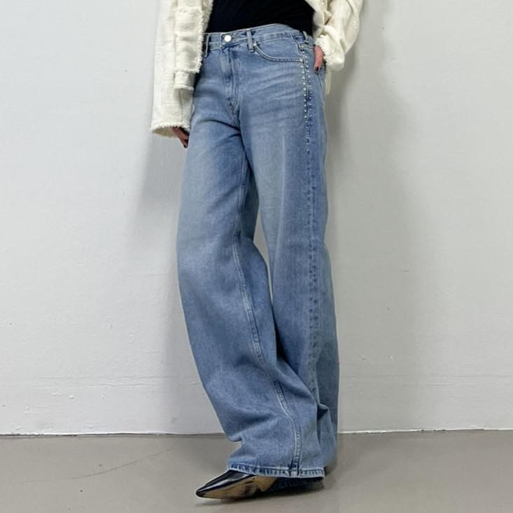 스터드 찡 데님 팬츠 보헤미안 와이드 롱