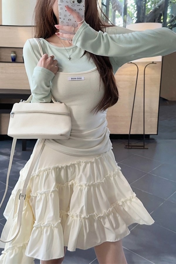 set 그린 긴팔 티셔츠+레이어드 나시+케이크 프릴 미니스커트 3P 셋업
