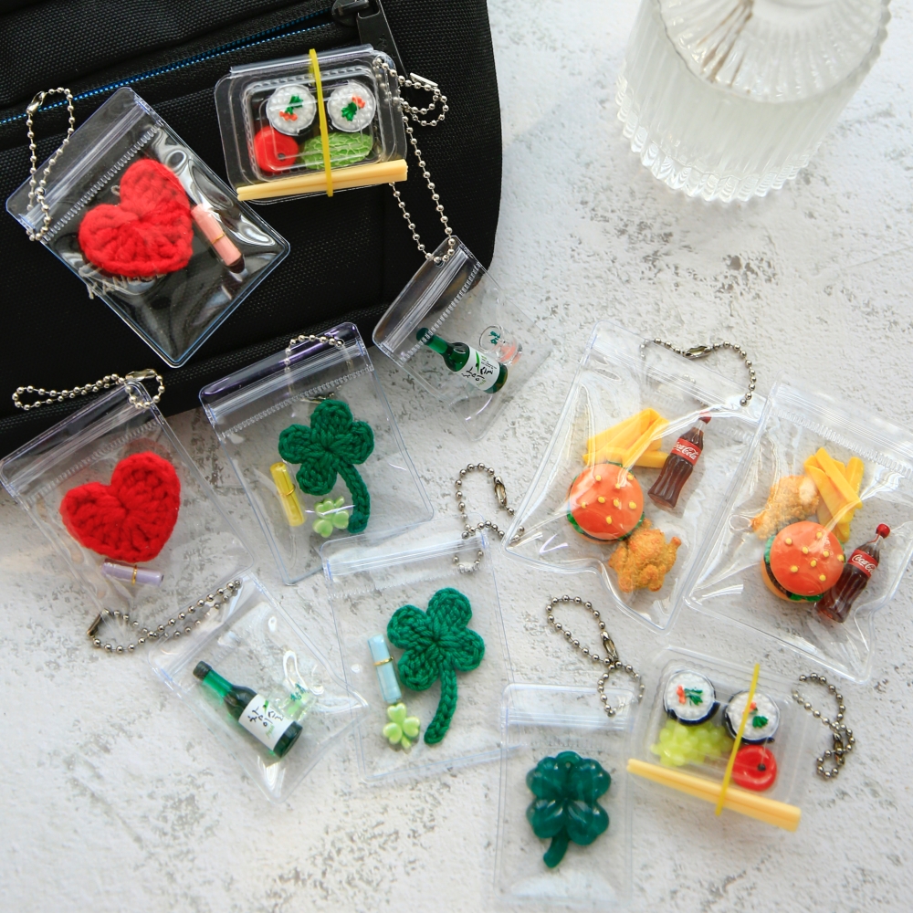 뜨개 네잎클로버 하트 미니 투명 PVC 지퍼백 키링 [6종 도시락 햄버거 세트 음식 김밥 소주 열쇠 고리 가방 콜라 감자튀김 모형]