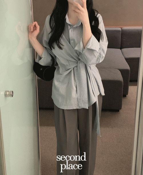 [하객룩🤍] 레르 스트라이프 루즈핏 랩 매듭 긴팔 봄 블라우스 (1color)