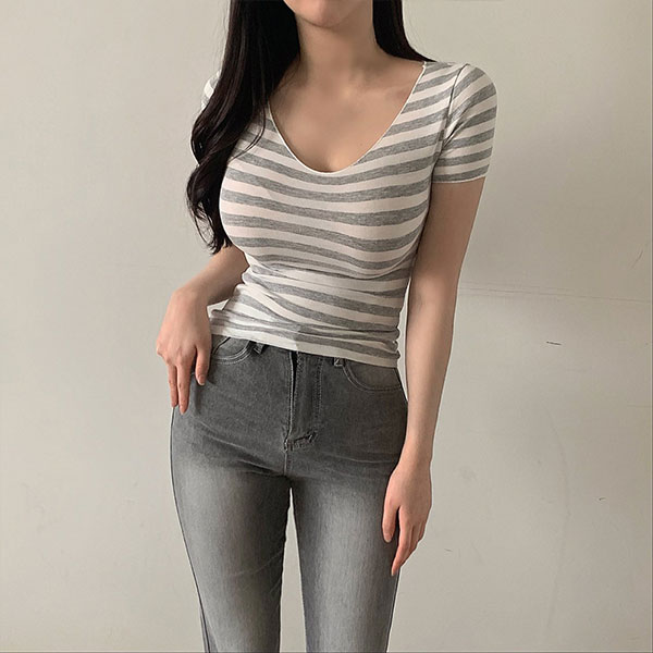 단가라 브이넥 스트라이프 슬림 반팔티셔츠 이너티 스판티 세미크롭 유넥티 라운드티 크롭티