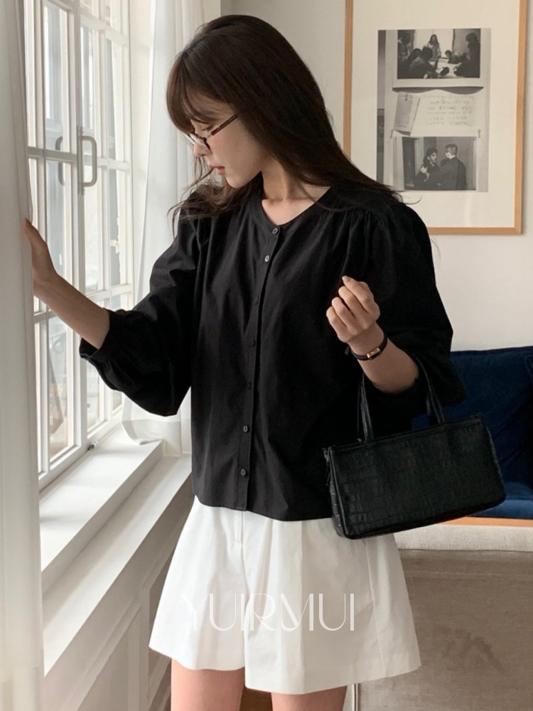 vergamot 베르가못 캐시 셔링 벌룬 노카라 라운드 블라우스 2color