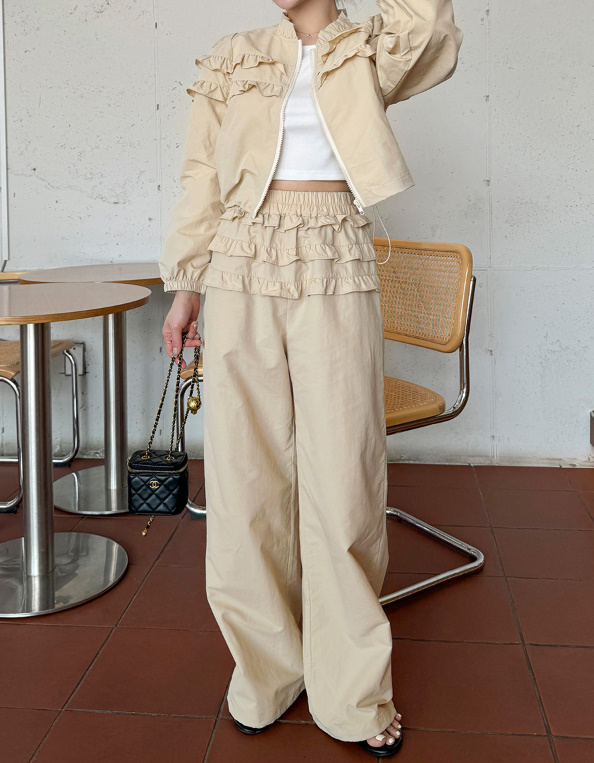 슈비 프릴 세트 (투피스 윈드 바스락 자켓 팬츠 와이드 밴딩 봄신상 크롭) - 베이지, 블랙