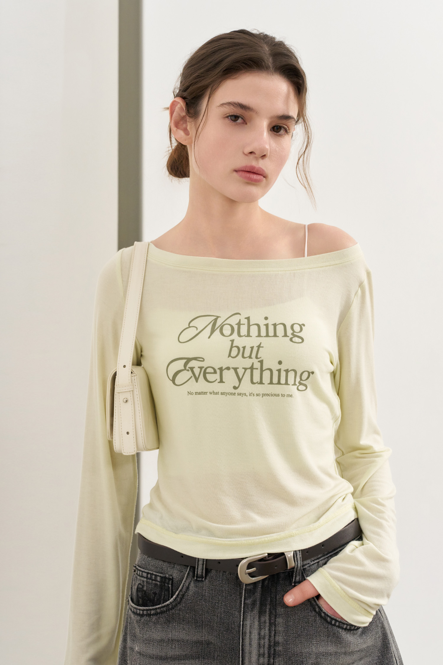 WOMAN 와이드넥 레터링 슬림 롱 슬리브 티 [APPLE GREEN]