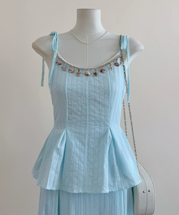 ★휴가룩 추천★ [끈나시 블라우스 & 스커트 투피스] 라운드넥 끈 스트랩 불가사리 조개 장식 핀턱 슬림 캐미솔 & 하이웨스트 스트라이프 프린지 수술 A라인 롱 치마 셋업 세트 동남아 신혼 여행룩 휴양지룩
