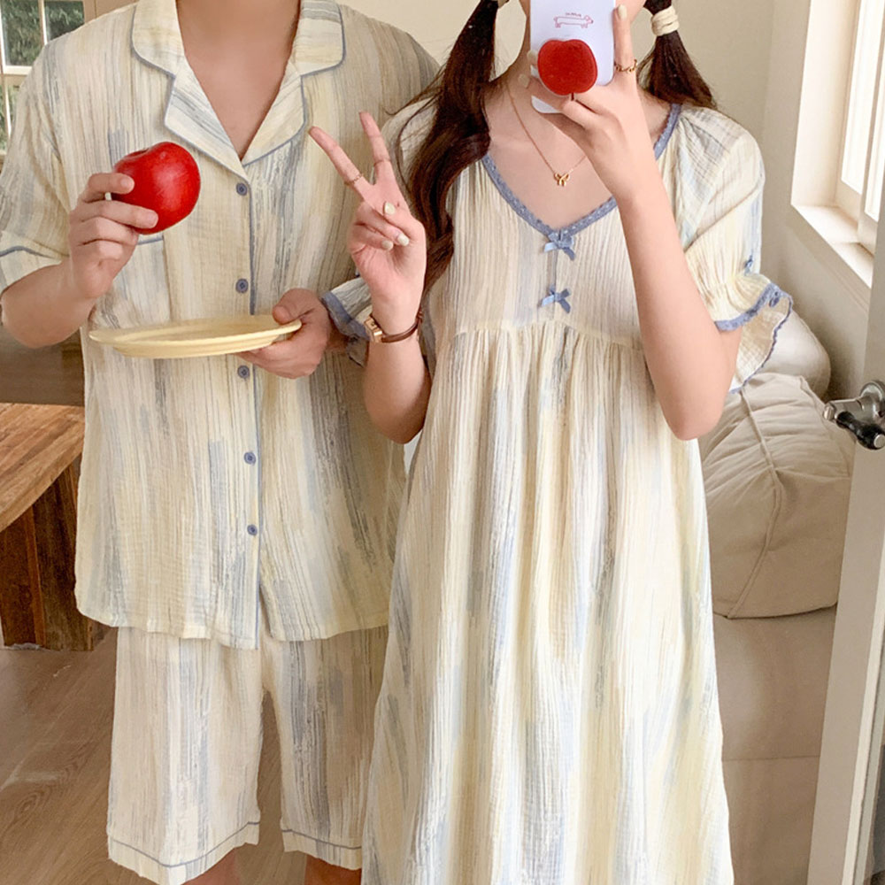 빅사이즈 수채화 원피스 커플 잠옷 여자 남자 여름 반팔 순면 임산부 파자마 세트 홈웨어